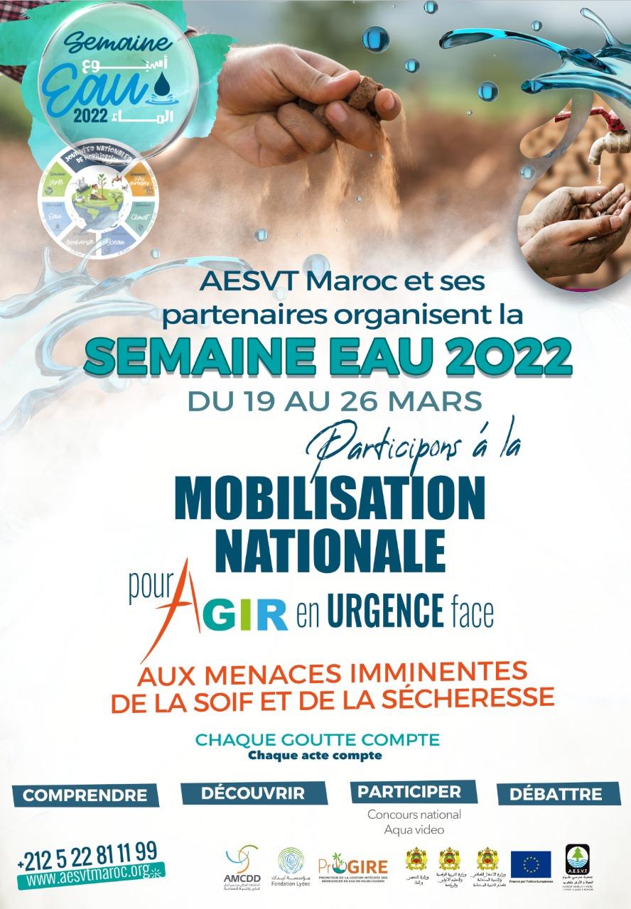 17 Mar, 2022 AESVT-Maroc et ses partenaires organisent du 19 au 26 mars, la SEMAINE EAU 2022 'AESVT-Maroc et ses partenaires organisent du 19 au 26 mars, la SEMAINE EAU 2022