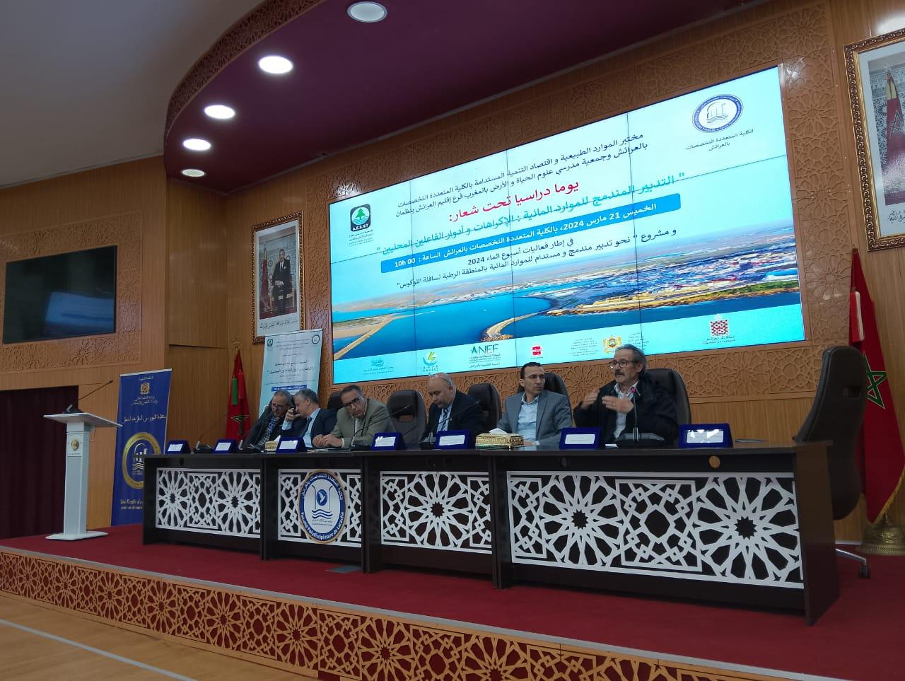 نظمت جمعية مدرسي علوم الحياة و الأرض بالمغرب فرع إقليم العرائش بشراكة مع مختبر الموارد الطبيعية و اقتصاد التنمية المستدامة بالكلية المتعددة التخصصات بالعرائش، و بتنسيق مع المديرية الإقليمية لوزارة التربية الوطنية و التعليم الأولي و الرياضة، جماعة العرائش، مجلس إقليم العرائش، وكالة الحوض المائي اللوكوس، المديرية الإقليمية للوكالة الوطنية للمياه و الغابات، الوكالة المستقلة الجماعية لتوزيع الماء و الكهرباء بإقليم العرائش، المديرية الإقليمية لوزارة التجهيز و الماء، يوما دراسيا تحت شعار ” التدبير المندمج للموارد المائية : الاكراهات و أدوار الفاعلين المحليين”، و ذلك يوم الخميس 21 مارس 2024 بالكلية المتعدد التخصصات بالعرائش.